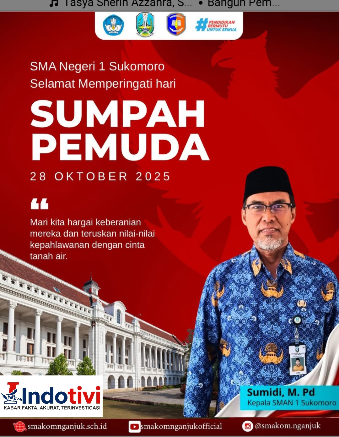πππΌππ ππ, πππΏπππππ, – SMA Negeri 1 Sukomoro dan MKKS SMA Negeri Nganjuk mengucapkan Selamat Hari Sumpah Pemuda! Pada momen spesial ini, kami memperingati semangat dan komitmen para pemuda Indonesia dalam memperjuangkan kemerdekaan dan kemajuan bangsa.
