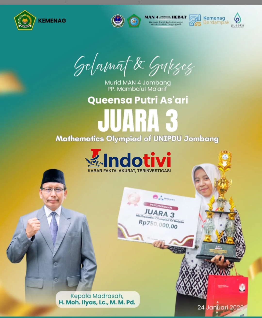 JOMBANG, INDOTIVI,– Siswi MAN 4 Jombang PP. Mamba’ul Ma’arif, Queensa Putri As’ari, berhasil meraih prestasi gemilang sebagai Juara 3 dalam ajang Mathematics Olympiad yang diselenggarakan oleh UNIPDU Jombang. Prestasi ini menjadi bukti kerja keras dan dedikasi dalam menguasai ilmu matematika.
