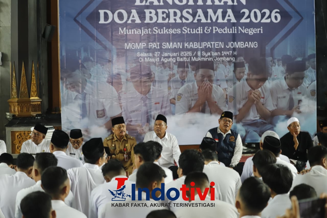 JOMBANG, INDOTIVI,– Masjid Agung Baitul Mukminin Jombang menjadi pusat kekuatan spiritual bagi ribuan siswa kelas akhir di Kabupaten Jombang pada Selasa (27/1/2026) pagi. Ribuan siswa SMA Negeri se-Kabupaten Jombang, yang juga diikuti oleh perwakilan SMA Swasta dan MAN 1 Jombang, memadati ruang utama masjid untuk mengikuti kegiatan “Doa Bersama Meraih Sukses Akhir Studi”.