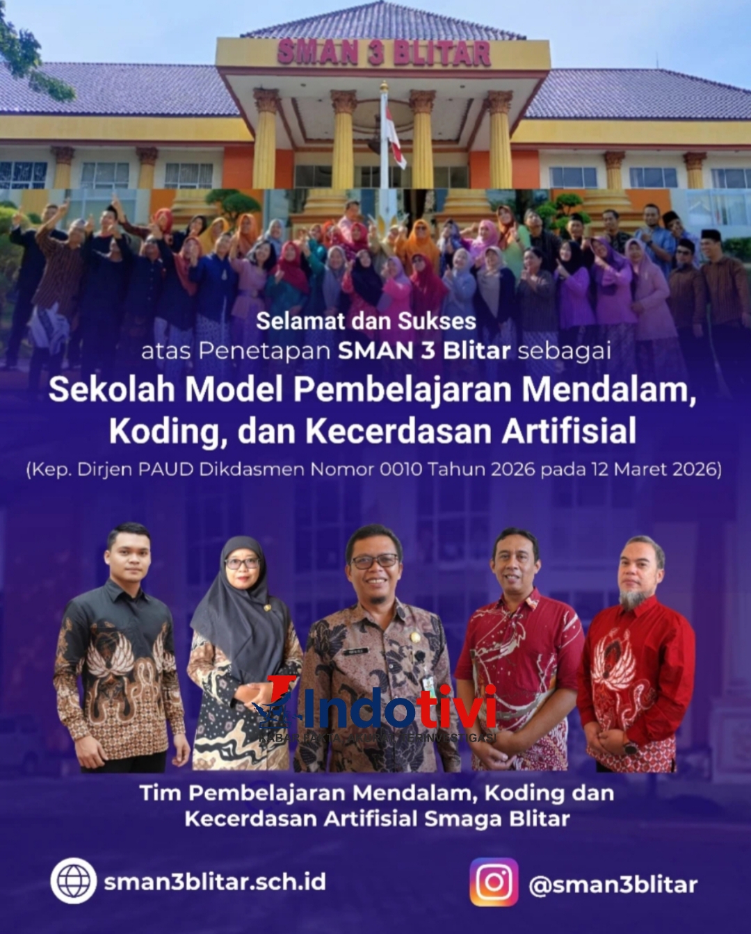 BLITAR, INDOTIVI,– SMA Negeri 3 Blitar meraih pencapaian gemilang setelah ditetapkan sebagai Sekolah Model Pembelajaran Mendalam, Koding, dan Kecerdasan Artifisial (AI) jenjang SMA. Penghargaan ini menjadi bukti komitmen sekolah dalam mengembangkan pembelajaran berbasis kemampuan abad ke-21.Penetapan berdasarkan Kep. Dirjen PAUD Dikdasmen Nomor 0010 Tahun 2026 tanggal 12 Maret 2026