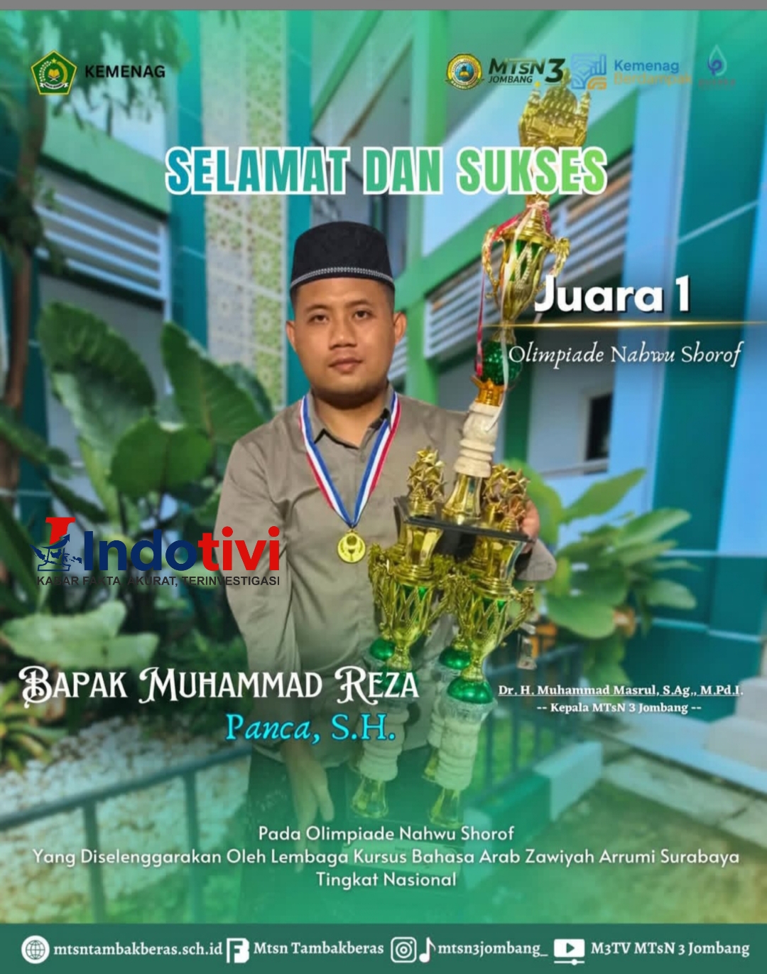 JOMBANG, INDOTIVI,– Bapak Muhammad Reza Panca, S.H. berhasil meraih prestasi gemilang dengan menjadi Juara 1 Olimpiade Nahwu Shorof Tingkat Nasional, yang diselenggarakan oleh Lembaga Kursus Bahasa Arab Zawiyah Arrumi Surabaya. Prestasi ini menjadi kebanggaan bagi Madrasah Tsanawiyah Negeri (MTsN) 3 Jombang.