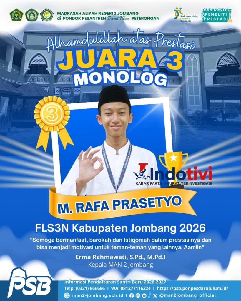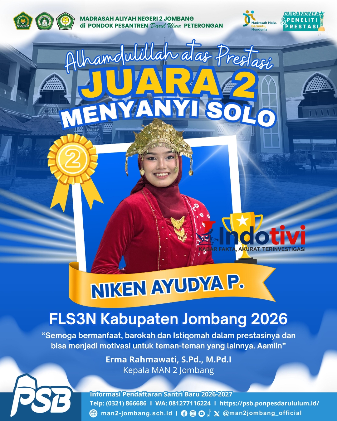 JOMBANG, INDOTIVI, – Kabar membanggakan datang dari Madrasah Aliyah Negeri 2 Jombang di Pondok Pesantren Darul Ulum Peterongan. Salah satu siswanya, Niken Ayudya meraih juara 2 cabang menyanyi solo dan M. Rafa Prasetyo, berhasil meraih Juara 3 cabang lomba Monolog pada ajang Festival Lomba Seni dan Sastra Siswa Nasional (FLS3N) Tingkat Kabupaten Jombang Tahun 2026.