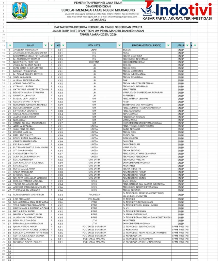JOMBANG, INDOTIVI, – Alhamdulillah, SMA Negeri Mojoagung meraih pencapaian membanggakan dengan sebanyak 63 siswa berhasil lolos masuk Perguruan Tinggi Negeri (PTN) melalui jalur Seleksi Nasional Berdasarkan Prestasi (SNBP). Dari 12 SMA Negeri yang ada di Kabupaten Jombang, sekolah ini menempati posisi terbanyak.