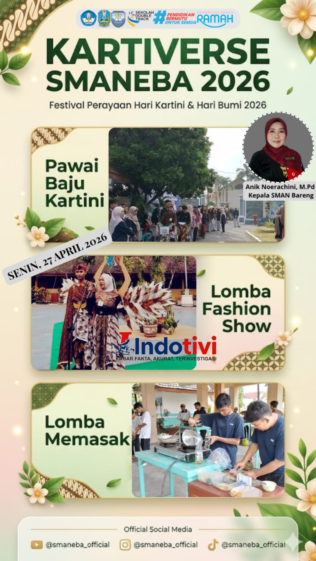 JOMBANG, INDOTIVI, – SMAN Bareng atau SMANEBA sukses menggelar festival bertajuk KARTIVERSE SMANEBA 2026,Senin, 27 April 2026. Acara ini digelar dalam rangka memperingati Hari Kartini dan Hari Bumi 2026, mengusung semangat emansipasi sekaligus kepedulian lingkungan.